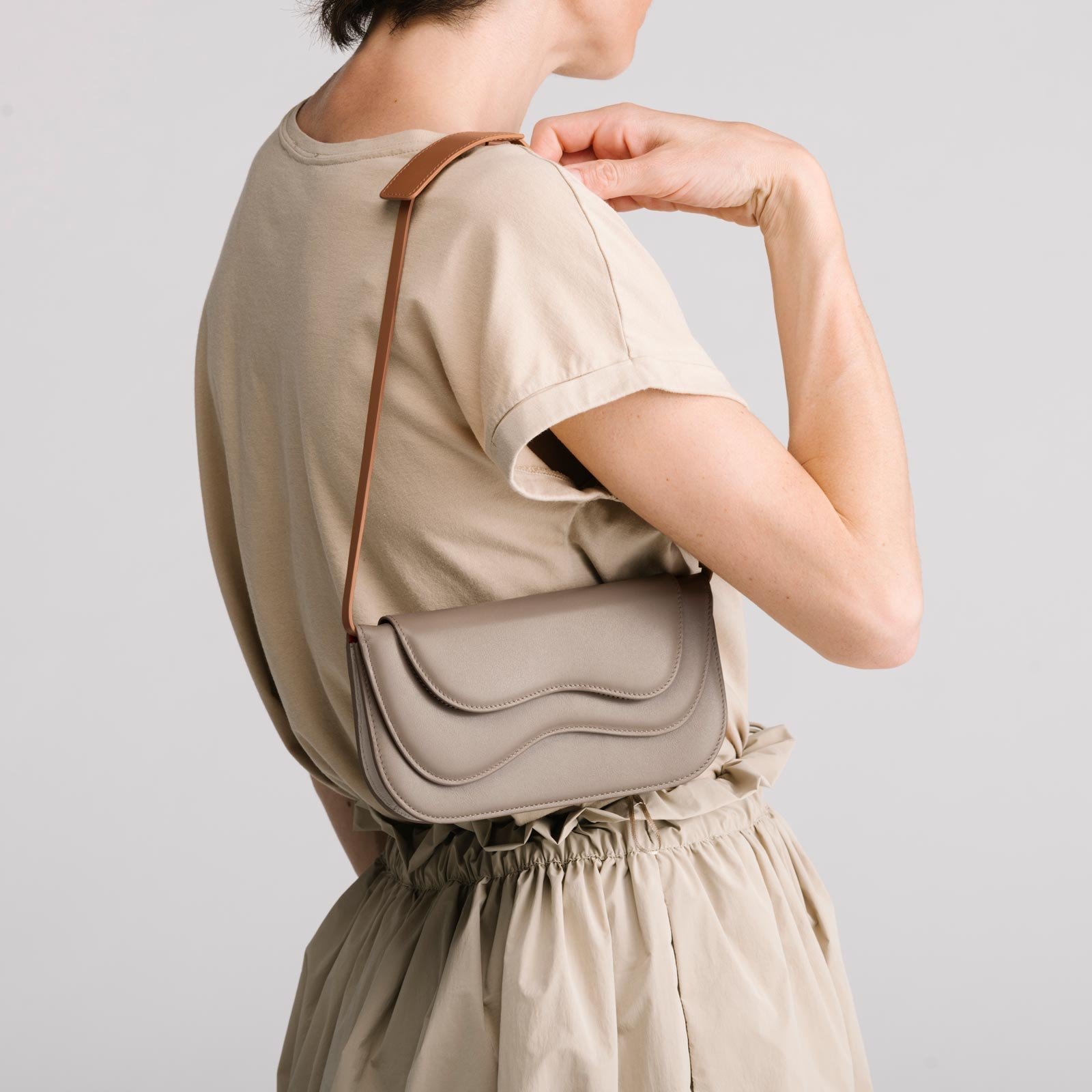 The Wave Wallet, a wallet-turned-shoulder-bag. The Wave Wallet features two conjoined leather flaps that open to reveal space for all your financial essentials. A leather divider creates two compartments, with one side for notes and cards, and the other large enough to fit the iPhone Max, and your passport. Spacious enough to hold more than your usual coin purse, yet compact enough for you to locate your metro card lickity-split, Wave Wallet is as utilitarian as it is covetable.